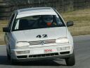 Rallycross Despite 40+ events as co-driver in a rally car in the 1990s, I'd never driven competitively on dirt until I entered a RallyCross with the Tarheel Sports Car Club. Rules for this event required competitors to race on street tires, to preserve the dirt surface of a course laid out in a field with cone gates. Each competitor's score was the total time required to complete six 1-lap runs, plus a 2-second penalty for any cone knocked down. I ran on my full-tread Toyos from PhilsTireService.com (actually, my road racing rain tires) which proved to be surprisingly effective in the silty soil. The GTI was in its stock configuration, minus the unnecessary seats, and I vowed to apply a conservative strategy, avoiding cone points while increasing speed over the course of the day. Unfortunately, a lost shift linkage nut stranded me at the start of my third run earning me the "bogey" time of 60 seconds for that pass - on a course that saw my best time in the mid-32-second range. The problem was easily repaired but not before I had dropped to 15th of the 17 entrants in the 2-liter class. Highlight - Sixth-fastest time in class in the final heat of the day, and no cone penalties or missed gates. |