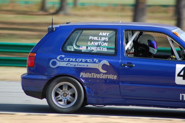 Motorsports Park This two-hour enduro was chosen as a test day, in preparation for the 12 Hours at the Point, coming up in less than a month. Everything went very well, with further adjustments resulting in a fun, oversteering car on what turned out to be a very slick Carolina Motorsports Park track. Unfortunately the ECR series rules mandated two stops of a minimum of 5 minutes each - whether we needed fuel or not - which effectively eliminated the mileage advantage typically enjoyed by PhilsTireService.com Team GTI. After a faulty engine control unit was discovered and replaced following the last event, the Conover drivetrain behaved flawlessly but additional tuning is still necessary if we are going to get maximum performance out of the new car. Additional testing is scheduled before the 12 hours at Summit Point. PS - We received notice that, following an audit of the results, our two pit stops were approximate 5 seconds short of the required minimum. This error resulted in a four-lap penalty in the official results but did not affect our 2nd-place finish. |