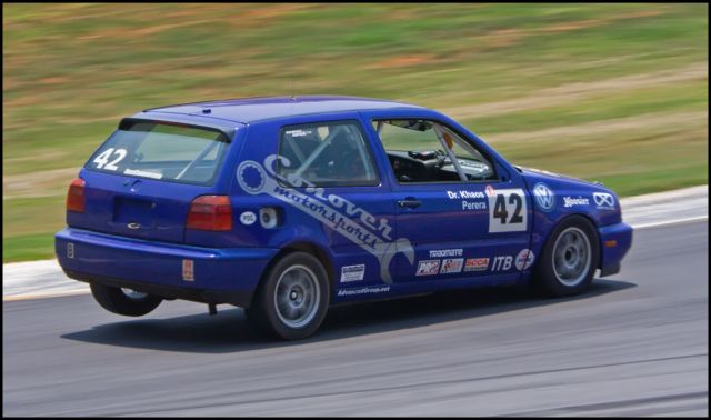 Kirk Knestis struggled in his Mid-Ohio debut at the IT SPEC*tacular, never getting the Golf near the front of what was certainly the strongest ITB field assembled in the USA so far this season. The unique format of this event rewards a team that's fast right out of the trailer and consistent through the qualifying session, both 40-minute races, and the "qualifying race" that separates them. Knestis, being new to the track, started the weekend short on the first account by qualifying only 15th of the 21 entries - well off the times set by pole sitter Beran Peter (Wayland, MA) in his similar Golf and pace-setters Vaughan Scott (Porsche; Royal Oak, MI) and Chris Schaafsma (MkII Golf; Wheaton, IL). Saturday's race saw Knestis' fortunes improve however, as he moved up to 10th in class and turned lap times within 1/2 second of the top 5 in class. Some success in Sunday morning's qualifying race would put him within shouting distance of the pointy end of the field... Sadly, fate intervened. Following a pace lap that left the ITB field strung out around the track, Knestis had a huge run on the rows ahead as Cameron Conover shouted "green, green, green!" over the in-car radio. While his competitors certainly disagreed at the time, witnesses support Knestis' contention that he did not improve his position before the flag (the definition of a "false start" under SCCA rules) and the timing was such, that he was into the top six and on the inside line by the time the field reached Turn 1. This maneuver might have paid dividends too, had 5th-place qualifier Dave Gran (Newington, CT) not locked up, perhaps assisted by a patch of track still wet from overnight rains, and spun his Honda right in the blue Golf's path. In the process of almost completely missing the now-sideways Prelude, Knestis collided with the VW of innocent bystander Aaron Stehley (Minneapolis, MN) and ended up in the gravel trap with substantial body damage as the field headed off to complete Lap 1. Knestis was able to extract himself but was resigned to 12th at the end, assisted by some in-class attrition. Under the SPEC*tacular rules, this is where he started the last race of the weekend, following some banging of panels and a suspension re-alignment by Conover's crew. Race stewards made sure the pace lap was under control for this one but Knestis was on the move again on the first lap - dispatching David Gills' Ford in the Keyhole, and both Todd Lincoln's Mercury and Tom Kelly's Golf under braking for Turn 7. Kelly defended well, however, leaving Knestis on the dirty outside line for the notorious cresting left they call Madness - and oversteering into the grass at the exit. Again, the field streamed by. Knestis rejoined at the back, clawed past several cars, and with the wind pretty much out of his sails, ended up mired again in 12th - destined to be tied for 14th in the overall weekend points total. The event itself was a great success and perhaps the Improved Touring social event of the year - some consolation to a team that was well and truly beaten, and beaten up on, over the course of this weekend. Congratulations go to Peter for taking the SPEC*tactular title, and to Scott and Schaafsma for their 2nd- and 3rd-place finishes respectively. |